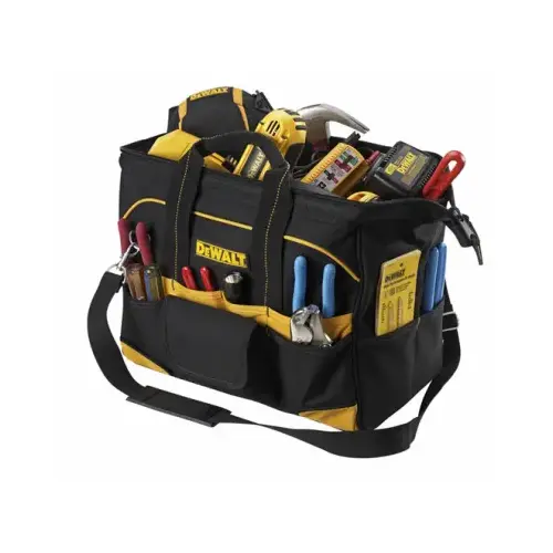 DeWalt's open design easy access tool carrier has 33 tool pockets and sleeves, a zippered main compartment, padded handles and abrasion-resistant rubber feet.