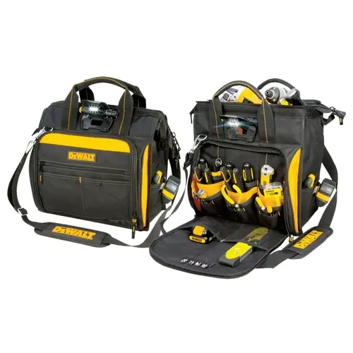 The tool bag has three levels of light output allow adjustment for wide area illumination or close up work with a light output of 39 Lumens max. There are 28 multi-use pockets inside and 13 outside to help you better organize your tools and the vertical pockets keep tools in sight for quick access. The tool bag has padded web carrying handles and adjustable shoulder straps for comfortable and convenient no hands transport and a base pad feet to help reduce wear and abrasion. The tool bag holds a multitude of tools and accessories like drills, extension cords, pliers, screwdrivers, wrench sets, drill bits, testers and much more.