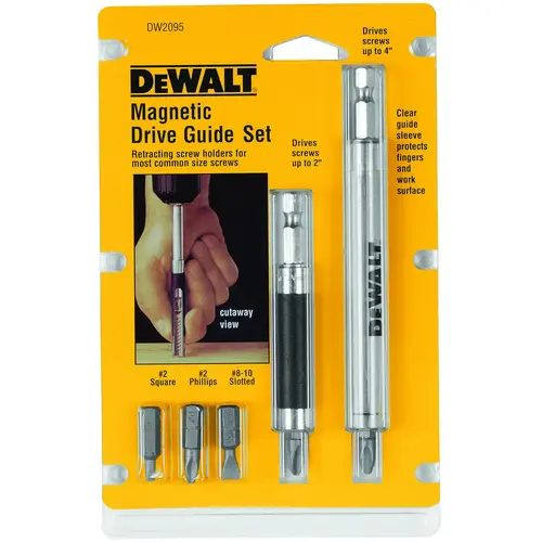 Drive screws up to 4 in length, tough, durable shank for extended life. Set includes three square/Phillips/flat head bits, one 2 in magnetic drive guide and one 4 in magnetic drive guide.