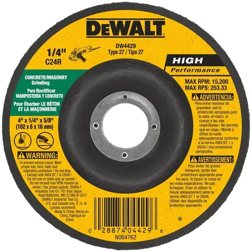 DEWALT DW4429 Grinding Wheel, 4 in Dia, 1/4 in Thick, 5/8 in Arbor, 24 Grit, Very Coarse Black/Yellow