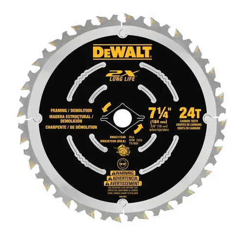 DeWALT Saw Blade, 7-1/4 in Diameter, 0.039 in Thickness, Carbide Cutting Edge, ATB Teeth, 24 Teeth, 5/8 in Arbor, 7000 rpm Speed, 18 deg Hook Angle, 0.063 in Kerf, Applicable Materials: Wood