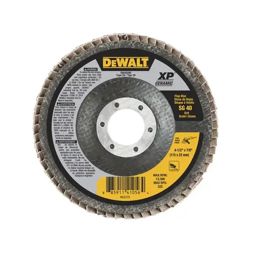 Dewalt XP Type 29 flap disc uses ceramic as the abrasive material and has a diameter of 4 1/2 in. Dewalt incorporates this ceramic material into the flap disc forming a grit of 40. All abrasive products that rotate or spin, such as the ones in this category, have a maximum speed at which you can run them. This Dewalt flap disc can be run at a maximum speed of 13300 RPMs.