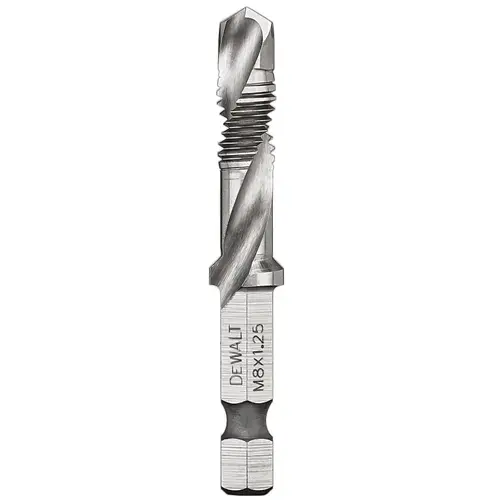 DeWALT IMPACT READY Tap and Drill Bit, 8 mm Dia, Flute Type: Spiral, Number of Flutes: 3, Shank Type: Hex, Shank Size: 1/4 in, Cutting Direction: Right Hand, HSS, Bright, 2-23/64 in L