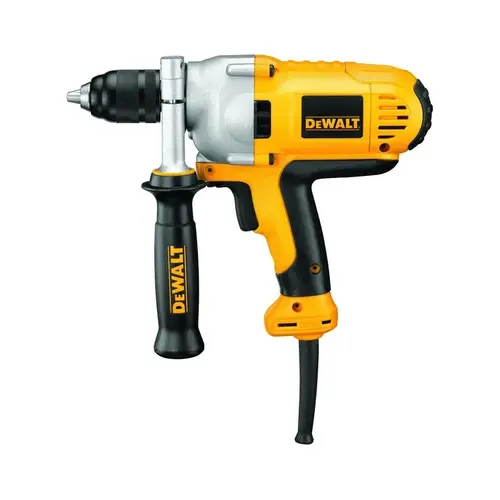 The DWD215G 1/2 in VSR mid-handle grip drill with keyless chuck has a powerful 10 A motor with overload protection to drill at 0 to 1250 rpm in forward or reverse. Constructed with soft-grip handle for comfort and housed in metal gear for durability.