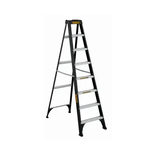 This 8 ft non-conductive DeWALT fiberglass step ladder has a load capacity of 250 lb, rated ANSI Type I. This ladder features an innovative top with magnet and multiple tool slots, an impact absorption system, slip-resistant aluminum shoes, wide back braces and double-rivet step construction. This DeWALT DXL3110-08 step ladder meets or exceeds the safety standards set by ANSI, CSA and OSHA.