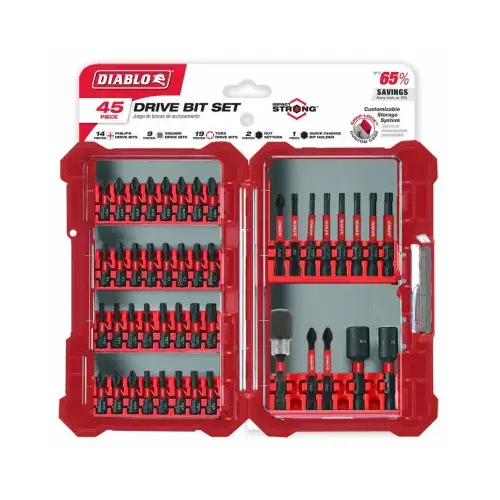 Diablo high-performance screw driving set delivers extreme durability and longer life in the installation and removal of fasteners. The included drive bits have an optimized tip design to provide a strong, precise grip that reduces wear, stripping and slippage. The magnetic nut setters and drive bit holder are designed with a high-strength, permanent magnet for a secure, anti-wobble grip when fastening screws and nuts. Torque-resistant design absorbs torque for less stress at the tip. This set is Impact Strong, delivering increased shank stability and durability in cordless and corded impact and drill drivers.