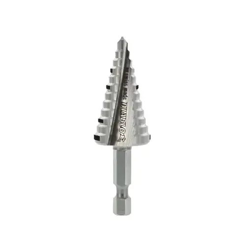 Diablo's new step drill bits bring exclusive technology to the electrician, plumber and HVAC contractor with fast, accurate cuts and increased stability in thin metals, PVC other plastic materials. The innovative split point tip design enables a fast, on-point start resulting in increased durability and up to 4X longer life. An automated precision grinding process on each step reduces wear and delivers 2X faster cuts. Multiple hole sizes are made easy with laser etched step markings while increased step heights for common hole sizes makes drilling holes more efficient and faster. Designed with a 1/4 in hex shank, these bits are impact ready and can be used with drills and impact drivers.