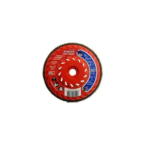 Diablo's steel Demon speed hub flap discs feature a premium zirconium grain blend for Up to 10X faster material removal when compared to standard grinding wheels. The flap discs special flap design offers flexibility and provides for a cushioned grinding effect. Diablo's high-performance flap discs combine two steps in one by simultaneously grinding and polishing.