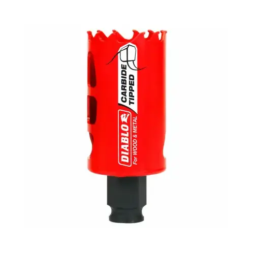 Diablo introduces the first carbide-tipped hole saws on the market to cut both wood and metal (wood, nail-embedded wood, plastic, aluminum, metal, cast iron, stainless steel and metal). Delivering 50X longer cutting life than bi-metal, these new carbide-tipped hole saws offer faster cutting performance and increased productivity.