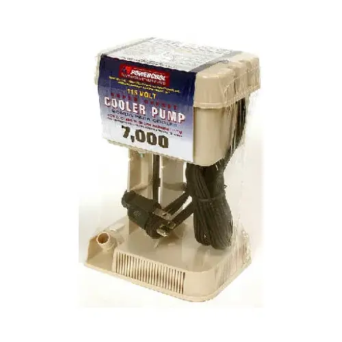 Molded 3 prong plug and extra-long grounded cord fits Champion cooler mounting bracket. Built-in supplementary pump screen, flame-retardant motor housing and auto-reset thermal overload protection. Corrosion-resistant shaft. Permalube bearings. Built-in barbed elbow. Removable base plate for ease of cleaning. Operates in water reservoirs of 1/2 to 4 in, 120 VAC, 60 Hz, UL classified.