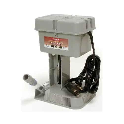 Molded 3 prong plug and extra-long grounded cord fits Champion cooler mounting bracket. Built-in supplementary pump screen, flame-retardant motor housing and auto-reset thermal overload protection. Corrosion-resistant shaft. Permalube bearings. Built-in barbed elbow. Removable base plate for ease of cleaning. Operates in water reservoirs of 1/2 to 4 in 120 VAC, 60 Hz, UL classified.