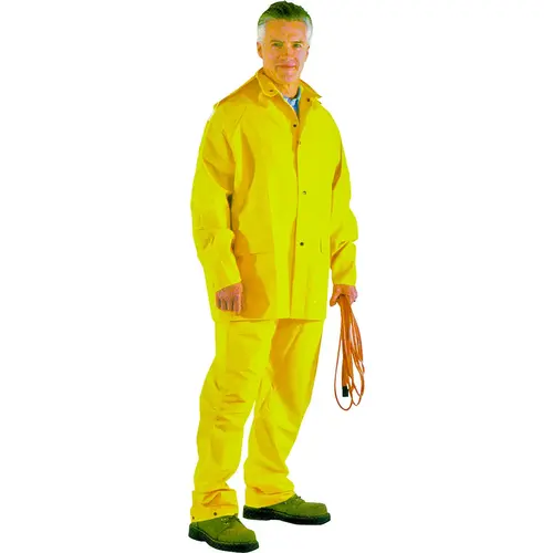This Diamondback jacket Includes a detachable hood and bib overall. It's heavy 0.35 mm PVC exterior laminated to polyester with a PVC interior coating is for extra strength and durability. It features full cut for a comfortable fit, corduroy collar, storm flap with concealed snap, vented cape yoke back and underarm vent with adjustable wrist and leg openings for a comfort fit. The full cut size allows you to fit over your clothing. It's 100% waterproof and non-conductive.