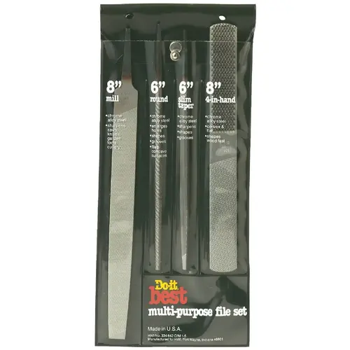 Contains 1 each 8" mill bastard, 8" 4-in-hand, 6" slim taper and 6" round bastard file.