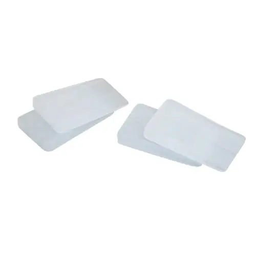 Ideal for leveling toilet bowls. Ribbed for stacking multipurpose. 4 plastic shims per card.