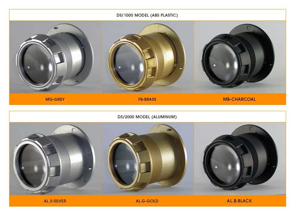 door viewers or peepholes. within the Home Security Solutions category: the DS/1000 Model with an ABS plastic body in Charcoal, Brass, and Grey, and the DS/2000 Model with an aluminum body in Gold and Silver. These models provide an impressive 168-degree wide-angle view, delivering clear images of visitors up to seven feet inside your home for quick and reliable identification. With a durable, maintenance-free design, easy installation, and affordability, Door Scope ensures long-lasting