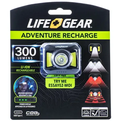 LifeGear Adventure 300 Lumens rechargeable headlamp is compact and lightweight. The headlamp is loaded with features including five light modes. High spot plus flood high, spot high, spot low, flood high, flood low. With a built-in power level indicator this type-C USB headlamp is powered by a 850 mAh Lithium-Ion battery.