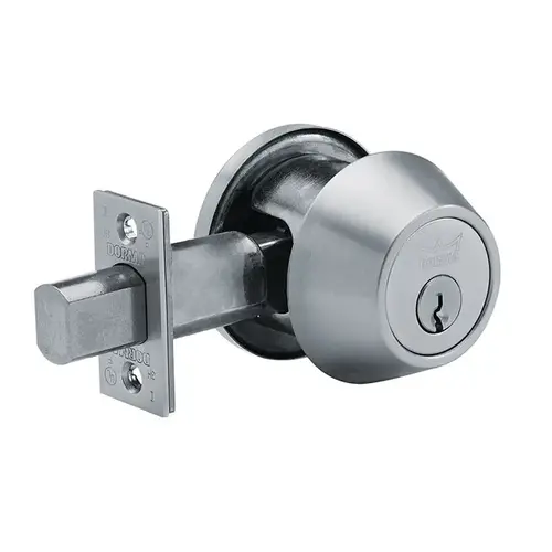 DORMA offers a choice of rugged dead bolts to provide an added level of protection. The D800 Series are Grade 1 dead bolts available in both 2-3/8" and 2-3/4" (standard) backsets. The large dead bolt is made from stainless steel for strength and corrosion resistance. A Heavy-Duty brass cylinder in a hardened steel housing surrounded by a heavy steel spin ring complete the security package in the door. This is coupled with a solid steel strike for use in a hollow metal frame and an additional reinforcing plate with 3" screws for wood jamb installations. All of these features provide an exceptionally strong and secure dead bolt. All steel parts are zinc dichromate plated.