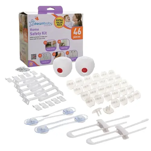 Dreambaby home safety value kits 46-pieces contain everything you need to help make sure your home is as safe as possible for your little ones. It includes 10-safety catches, 30-outlet plugs, 2-cabinet sliding locks, 2-multi-purpose latches and 2-doorknob covers. Dreambaby home safety value pack 46-pieces provide a one stop solution to all your childproofing and home safety needs.