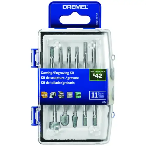 This 11-piece accessory micro kit is specially curated to perform all carving and engraving applications. It provides the organized storage of popular Dremel accessories in a small, compact footprint. This accessory set offers a reusable storage case with clear lid and lift-out tray for easy organization of the included bits.