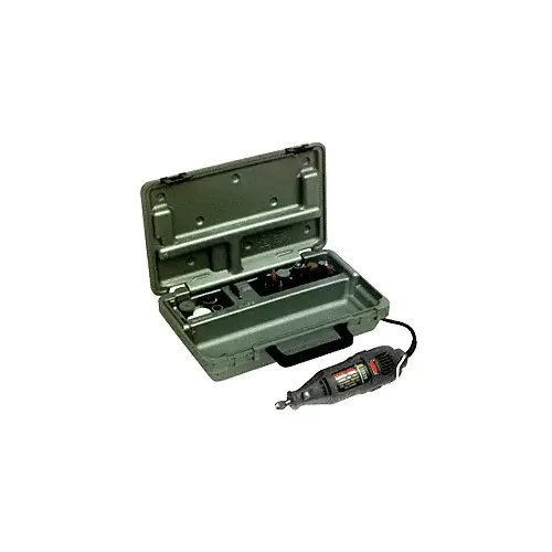 The CRL Dremel Motor Tool Kit consists of a Model 395 variable-speed (5,000-30,000 RPM) Moto-Tool with ball bearing motor construction to reduce friction for longer life; double insulated motor so grounding is not required; thrust bearing for greater drilling capacity; compact two wire coil cord for convenient storage in kit box.