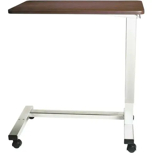 Non-Tilt Automatic Overbed Table. Wild Cherry. U-Base With Chrome Frame. Spring-Loaded Lift Mechanism With Height Adjustment From 30" To 45". 2" Casters. 32 x 18" High-Pressure Laminate Top With T-Molding. 100 Lb Weight Capacity. Column Can Be Mounted On Left Or Right Side. With Vanity. Mfg #16009-UCWCV