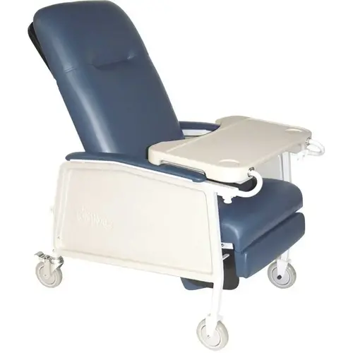 Drive Three-Position Recliner. 250 Lb Weight Capacity. Overall Dimensions 47H x 25W x 41"D. Inside Seat Width: 19"; Inside Seat Depth: 19". Three Positions: Upright, Deep Recline And Elevated Legrest/Footrest. Wide, Comfortable Armrests Are Angled To Provide Support In Any Reclined Position. Neutral Colored, Sturdy Steel Frame Is Easy To Clean And Maintain. Self-Adjusting Suspension Prevents Bottoming Out And Moisture Barrier On Seat Prevents Seepage. Comfortable Built-In Head Rest. Large Blow-Molded Tray Can Be Locked In One Of Five Positions Or Stored On The Side Of The Chair. 5" Casters, Two Locking. Foam And Vinyl Meet CA #117 And Boston Fire Department Specifications. Blue Ridge Color. Limited Lifetime Warranty On Frame. 1-Year Warranty On Upholstery And Moving Parts. Mfg #D574-CHOC