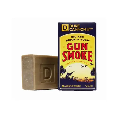 An ideal fall Saturday in Duke Cannon country involves just that - the country. There isn't a minivan in sight and the closest spoils of concrete are a good thirty miles away. While surrounded by your hunting buddies (two or four-legged), the sun pulls itself above the horizon line and you're filled with that particular adrenaline as your first shot rips across the sky. Our new Big Ass Brick of Soap - gun smoke attempts to capture that moment. The whiff you'll get isn't exactly metallic Cordite; rather, notes of smoked wood, bourbon vanilla, and charred leather combine to form a rich, slightly smoky scent that reminds you of a successful morning spent alongside your favorite fellow sportsmen.