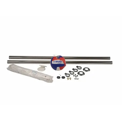 (2) 60" x 1.90 dia. Stainless Steel Posts with Escutcheon Rings, Anchor Covers, red/white/blue colored Volleyball, Brass & Steel Hardware, & 24' heavy duty Net with Shortening Kit