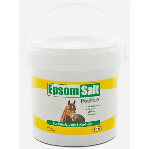 • Apply to painful or swollen muscles, legs, joints or insect bites. Durvet's Epsom Salt Poultice can be covered with cotton and/or wrapped. Will not burn or blister skin. Let draw and soothe for 36 to 48 hours. Repeat as needed for relief of soreness and swelling.