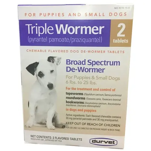 Triple Wormer is for the treatment and control of roundworms (Toxocara canis, Toxascaris leonina), hookworms (Ancylostoma caninum, Ancylostoma braziliense, Uncinaria stenocephala) and tapeworms (Dipylidium caninum, Taenia pisiformis) in dogs and puppies.