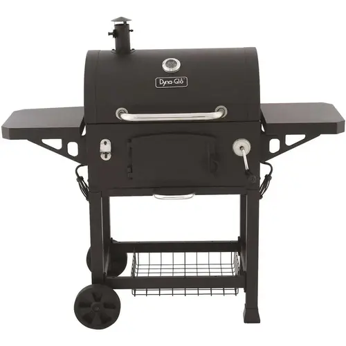 Anytime is the right time to cook on this heavy-duty charcoal grill from Dyna-Glo. With over 686 sq. in. of barbecue cook space, you can serve up BBQ ribs, grilled chicken, grilled salmon, grilled vegetables and more with that smoky barbecue flavor your family and friends will enjoy for years to come. Each cooking grate is made with porcelain enameled cast iron for maximum searing and heat transfer to all your bbq foods. Customize the cooking temperature of this barbeque grill by using the adjustment crank to raise and lower the charcoal tray. Reloading or stoking charcoal is made simple by opening the steel access door on the front of the bbq grill or sliding the cooking grates to one side. The smoke stack features an adjustable flue for additional temperature control of the charcoal. The high capacity ash pan is removable for quick and easy clean-up after your barbecue is over.