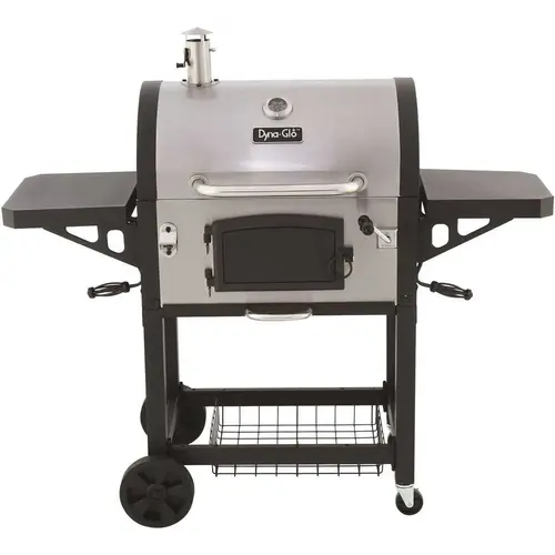 This Heavy-Duty Stainless Charcoal Grill from Dyna-Glo offers quality, performance and versatility. With 686 sq. in. of barbecue cook space, you can serve up BBQ ribs, grilled chicken, grilled salmon, grilled vegetables and more with that smoky barbecue flavor your family and friends will enjoy for years to come. Designed for efficiency and control, this bbq grill features an adjustable crank to raise and lower the charcoal tray. Porcelain enameled cast-iron cooking grates maximize heat transfer and create perfect searing on barbeque foods. You can easily customize the cooking temperature of this charcoal grill by using the adjustment crank to raise and lower the charcoal tray. To reload and stoke the charcoal, simply open the steel access door on the front of the grill. Achieve further heat control of this charcoal grill by adjusting the stainless smoke stack flue. The grill also features a double-walled lid and front firebox that help minimize heat loss and improve the burn efficiency of your charcoal. The 2 side tables serve as aides in preparing and holding your bbq food and tools as you cook with ease. Clean-up is simple with a removeable ash pan and wheels for storage.
