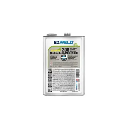EZ Weld Enviro PVC Cement Gray, Medium Body - Gallon (EZ30605) features a gray, medium-bodied, fast-setting solvent cement in a 128 oz can, designed for bonding PVC pipes and fittings up to 6" diameter across all schedules. Ideal for pool, irrigation, and DWV systems, it offers low-VOC compliance and requires a separate dauber or brush for application.Specs: 1 gallon (128 oz) capacity; meets ASTM D2564 and NSF/ANSI 61 standards; 32 degreeF to 110 degreeF application range.Application: Apply with a separate dauber or brush to clean surfaces; join fittings within 1 minute for a durable bond.
