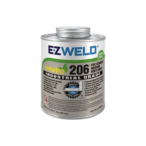 EZ Weld PVC Cement Gray, Medium Body - Quart (GL-3G) features a gray, medium-bodied, fast-setting solvent cement in a 32 oz can, formulated for bonding PVC pipes and fittings up to 6" diameter (Schedule 40) and 4" (Schedule 80). Ideal for plumbing, pool, and DWV systems, it offers low-VOC compliance and includes a dauber for precise application.Specs: 1 quart (32 oz) capacity; meets ASTM D2564 and NSF/ANSI 61 standards; 32 degreeF to 110 degreeF application range.Compatible with Schedule 40/80 PVC pipes; suitable for potable water, irrigation, and conduit systems.Installation: Apply with included dauber to cleaned surfaces; join fittings within 1 minute for a strong bond.