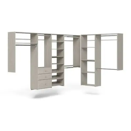 Easy Track 10-foot x 7-foot L-Shape Walk-In Closet Weathered Grey He Two-Kit Combination Includes Double-Hanging For Your Best Button Ups, Jackets, Pants And More. Shelving is included to hold sweaters, denim, and miscellaneous belongings. he shoe fence for easy access to footwear. And for some hidden storage, three drawers. 16.6 feet of hanging space 44.6 feet of shelf space Mfg #PH59-CG