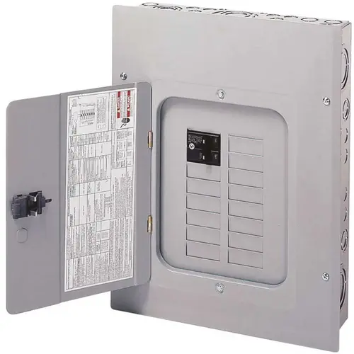 EATON Load Center, 120/240 VAC, 100 A, 1 ph, 12 Spaces, 24 Pole, 24 Circuits, Main Breaker, Plug-On Neutral, Type BR Breaker/Load Center, 10 kAIC Interrupt, #4 to 1/0 AWG Cable, 3-Wire Wiring Configuration, Bus Bar Material: Aluminum, NEMA 1 Enclosure, Flush, Surface Mounting, Includes: Cover