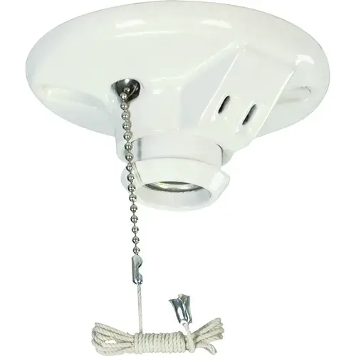 With 15 A 125 VAC outlet. High-strength insulator porcelain. Mounts on 4 in outlet boxes with breakout for 3-1/4 in box mounting. Pull chain socket interior is removable. Includes ball chain, 3 ft of cord, connector and end bell. Terminal screws are backed out ready for wiring without removing the interior. Dust ring protects against plaster and dirt. UL 496 listed, NOM certified, meets CSA requirements. 15 A, 125 V, 660 W.