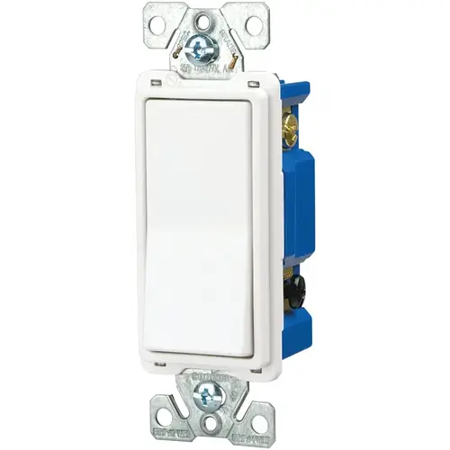 Ultrasonic welding and integrated construction of the strap and body. Backwire clamps on the side terminals for installation of #12 and #14 wire. Thermoplastic rocker, top and back body are virtually unbreakable. Screws accept slotted, Phillips and Robertson head tools for installation in both the USA and Canada. Longer, wider strap provides 40% more contact area to wall board. Virtually eliminates floating installations. Built-in wire stripper for #12 and #14 wire. Stippled ground screw standard. 15 A, 120/277 VAC rating for fluorescent lighting fixtures typical in commercial applications. Push in terminals accept #14 solid wire only. Temperature rating of -20 to 60 deg C. Meets flammability requirements per UL 94, 6504, V2 rated, VO rated. UL and cUL listed, meets all UL20 requirements.