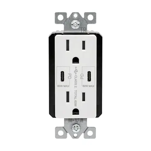 Eaton Receptacle, Tamper-Resistant, 125 V, 15 A, Wattage Rating: 60 W, USB Type: Type C, Wire Size: 14 to 12 AWG, NEMA Configuration: 5-15R, White, Dimensions: 4.21 in H x 2.03 in W x 1.79 in D