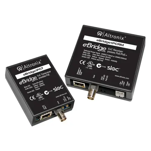 eBridge1PCRM and eBridge1PCTX are CAT5 to Coax cable Ethernet adapters/Media converters that deliver data and power over the coax cable in a PoE+ compliant format. The paired set enables fast 10/100Base-T Ethernet digital communication to be transmitted over Coax cable. An eBridge1PCRM receiver is powered by a PoE midspan or endspan product, such as a NetWay8M and NetWay16M and sends its power over the coax to the eBridge1PCTX transmitter under PoE protocol. This enables the eBridge1PCRM to be used in a managed manner, allowing for remote camera reset. The eBridge1PCTX, in turn, delivers that PoE+ compliant power to a PoE enabled camera or IP device. The eBridge1PCRM will not deliver power to non-compliant devices, thus avoiding damage to improperly connected analog cameras. These plug and play units facilitate system upgrades from analog to IP cameras/devices utilizing existing legacy Coax and eliminating the costs and labor associated with installing new network cabling. In addition, data transmission and power over the Coax is possible up to 457m in comparison to 100m Ethernet maximum distance (see Maximum Length of Coax Type vs. Camera Power/PoE Class, pg. 3). A maximum range from headend to the PoE camera/device is 610m taking into consideration that up to 100m of structured cable may be deployed at each end.