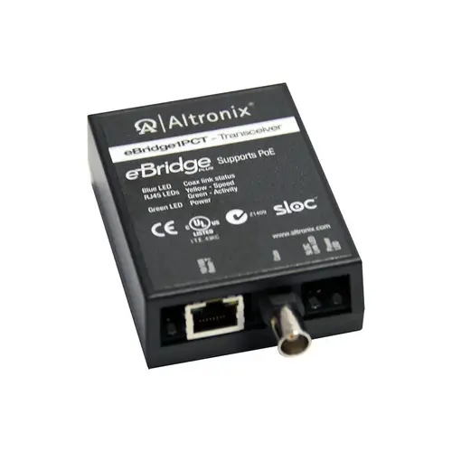 The eBridge1PCT is a CAT5 to Coax cable Ethernet adapter that delivers data and power over the coax cable in a PoE compliant format. The transceiver enables fast 10/100Base-T Ethernet digital communication to be transmitted over Coax cable. An eBridge1PCR, eBridge1PCRX, eBridge4PCRX, eBridge8PCRX or eBridge16PCRX receiver sends power over the coax to the eBridge1PCT transmitter under PoE protocol. The eBridge1PCT, in turn, delivers that PoE compliant power to a PoE enabled camera or IP device. These plug and play units facilitate system upgrades from analog to IP cameras/devices utilizing existing legacy Coax and eliminating the costs and labor associated with installing new network cabling. In addition, data transmission and power over the Coax is possible up to 457m in comparison to 100m Ethernet maximum distance (see Maximum Length of Coax Type vs. Camera Power/PoE Class, pg. 3). A maximum range from headend to the PoE camera/device is 610m, taking into consideration that up to 100m of structured cable may be deployed at each end.