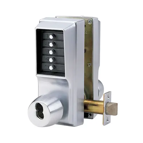 Cylindrical Knob Lock, Combination or Key Override Entry, Combination or Key Override Exit, 2-3/4" Backset, 3/4" Throw Latch, Medeco/Yale/ASSA/Abloy LFIC Prep, Less Core, Satin Chrome
