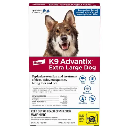K9 Advantix kills and repels fleas, ticks, mosquitoes, biting flies and lice. Simpler than a flea collar and hard-to-swallow pills, this topical formula works within 12 hours of initial application to stop existing flea infestations on dogs and prevent new ones by killing adult fleas on contact before they lay new eggs or bite your dog. K9 Advantix offers fast relief at an excellent value, so you and your dog can get back to the things you love most. Your dog should be at least 7 weeks old and weigh over 55 lbs. to use K9 Advantix Extra Large Dog. Use as directed by label. Do not use on cats.