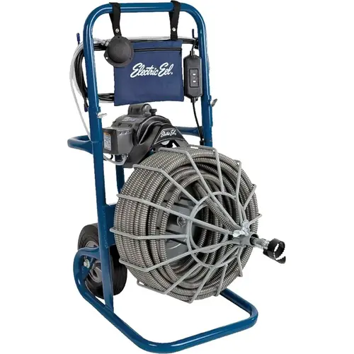 Includes standard five-piece tool set containing retriever tool, root saw, grease tool, starting drill and spanner wrench. Heavy-duty 1/3 hp Baldor capacitor start motor. Rugged frame constructed of 1-1/4 in steel tubing. Removable handle for easy transporting and work in tight spaces. Snap-lock couplings hold tools firmly in place. No screws required to connect tools. Built-in ground faucet circuit interrupter on a 20 ft. line cord to protect operator from electrical shock. Air foot switch and cord assembly standard for easy operation. Three-element tri-max cable. Large 10 in wheels for easy maneuvering. Reinforced cable cage holds 100 ft of tri-max cable and removes quickly for easy loading. Impact-resistant belt guard for additional operation safety.