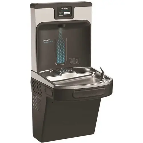Elkay Enhanced ezH2O Bottle Filling Station And Single ADA Cooler-Midnight Black. Quick Filter Change Wrapper Provides Easy Access To Filter From Front And Side Of Cooler For Convenient And Efficient Filter Change In Under A Minute. The 6,000-gallon filter is tested and certified to NSF 42 and 53 for lead, Class 1 particulates, chlorine taste and odor reduction. Touchless, sensor activation (bottle filler) designed for easy use; easy-to-operate push-bar activation (bubbler). Hermetically sealed refrigeration system provides chilled water to satisfy thirst. Fill rate is 1.1 GPM. Laminar flow provides clean fill with minimal splash. Real drain system eliminates standing water. Visual filter monitor with LED filter status indicator. FillSafe recognition automatically recognizes new filter and updates LED light back to green. Green Ticker informs user of number of 20 oz. plastic water bottles saved from waste. Key plastic components are manufactured with silver ion antimicrobial agent helping to provide clean, stain- and odor-free surfaces. Low-energy LED light encourages use, assists with filling dark bottles and illuminates in dark hallways. One-box packaging so the cooler and bottle filler ship together. Mfg #LZS8WSMP