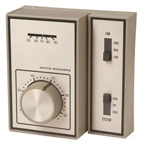 The Emerson 1A11-2 Fan Coil Thermostat is designed for direct control of line voltage valves and/or blower motors on fan coil units. This thermostat features manual changeover from Heat to Cool and a 3-speed fan switch: High - Medium - Low. The subbase is included.