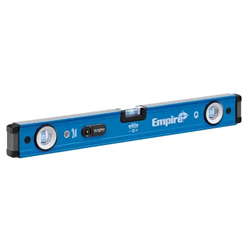 Empire True Blue UltraView LED Magnetic Box Level, Vial Type: Solid Block, Number of Vials: 3, Vial Material: Acrylic, Vial Positions: Level, Plumb, Accuracy: 0.0005 in/in, Number of Hang Holes: 1, Magnetic/Nonmagnetic: Magnetic, Aluminum, Blue, 24 in L, Includes: (2) AA Batteries
