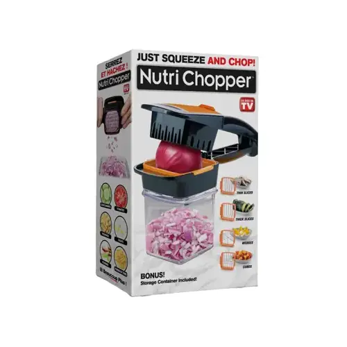 Stop chopping vegetables one slice at a time with nutri chopper, the incredible, compact, handheld kitchen slicer that cuts your vegetables with just one snap. The engineers at nutri chopper have combined five different interchangeable slicing options into one super slicer, so now you can chop thick slices, thin slices, cubes and more. Nutri chopper is ten times faster than your old knives, easier to use and dishwasher safe. The quick-lock function lets you store nutri chopper in a drawer, safe and secure.