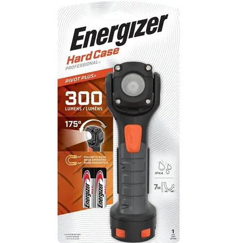 Finally, a professional work light that meets your demands. The swivel head of this Energizer Hard Case Professional Pivot Plus LED Flashlight delivers on-demand brightness when and where you need it. Its 175° pivoting head can direct up to 300 brilliant lumens of crisp, uniform light, illuminating objects up to 30 meters away. Go hands-free with its magnetic base and built-in lanyard. Designed with a rugged rubber outer mold, this heavy-duty flashlight can go through the ringer, tested to withstand drops from up to 7 meters high and last through extreme weather, courtesy of its IPX4 rating weather resistance. When your job gets demanding, demand the powerful pivoting light of Energizer Hard Case Professional Pivot Plus Flashlight.
