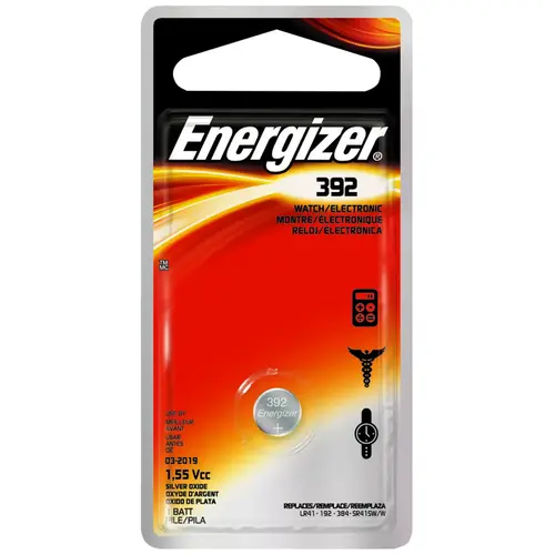 Designed for use on continuous low drain. Replaces LR41, 192, 384, SR41SW/W; Duracell D392, Energizer 392, Goldpeak 392, Maxell SR41W, Panasonic SP392, Rayovac 392, Renata 392, Sony SR41W, Timex K, Toshiba SR41W and Varta V392. 7.9 mm Dia x 3.6 mm H. 41 mAh to 1.3 V. 1.55 V, carded.